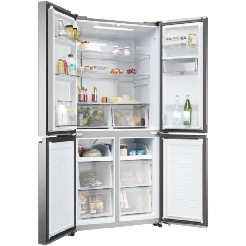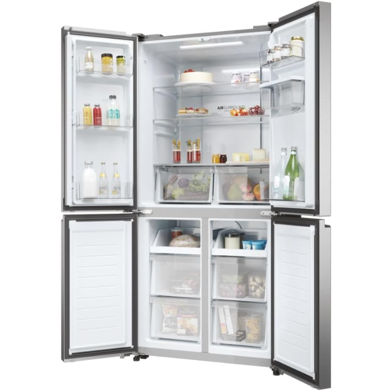 El Haier HCR3818EWMM es un frigorífico americano de 463 litros de capacidad, diseñado para ofrecer una solución de almacenamiento amplia y eficiente para hogares que requieren espacio adicional para conservar alimentos y bebidas. Incorpora un dispensador de agua integrado, lo que permite acceder a agua fría sin necesidad de abrir la puerta, mejorando la eficiencia energética y la comodidad diaria.