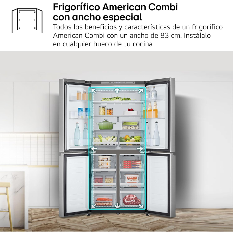 El LG Frigorífico Americano Combi 508-641L Door Cooling es un electrodoméstico de refrigeración de gran capacidad diseñado para hogares que requieren un almacenamiento amplio, eficiente y organizado de alimentos. Es adecuado para familias numerosas, personas que cocinan con frecuencia o usuarios que desean conservar grandes cantidades de productos frescos y congelados con tecnología avanzada.